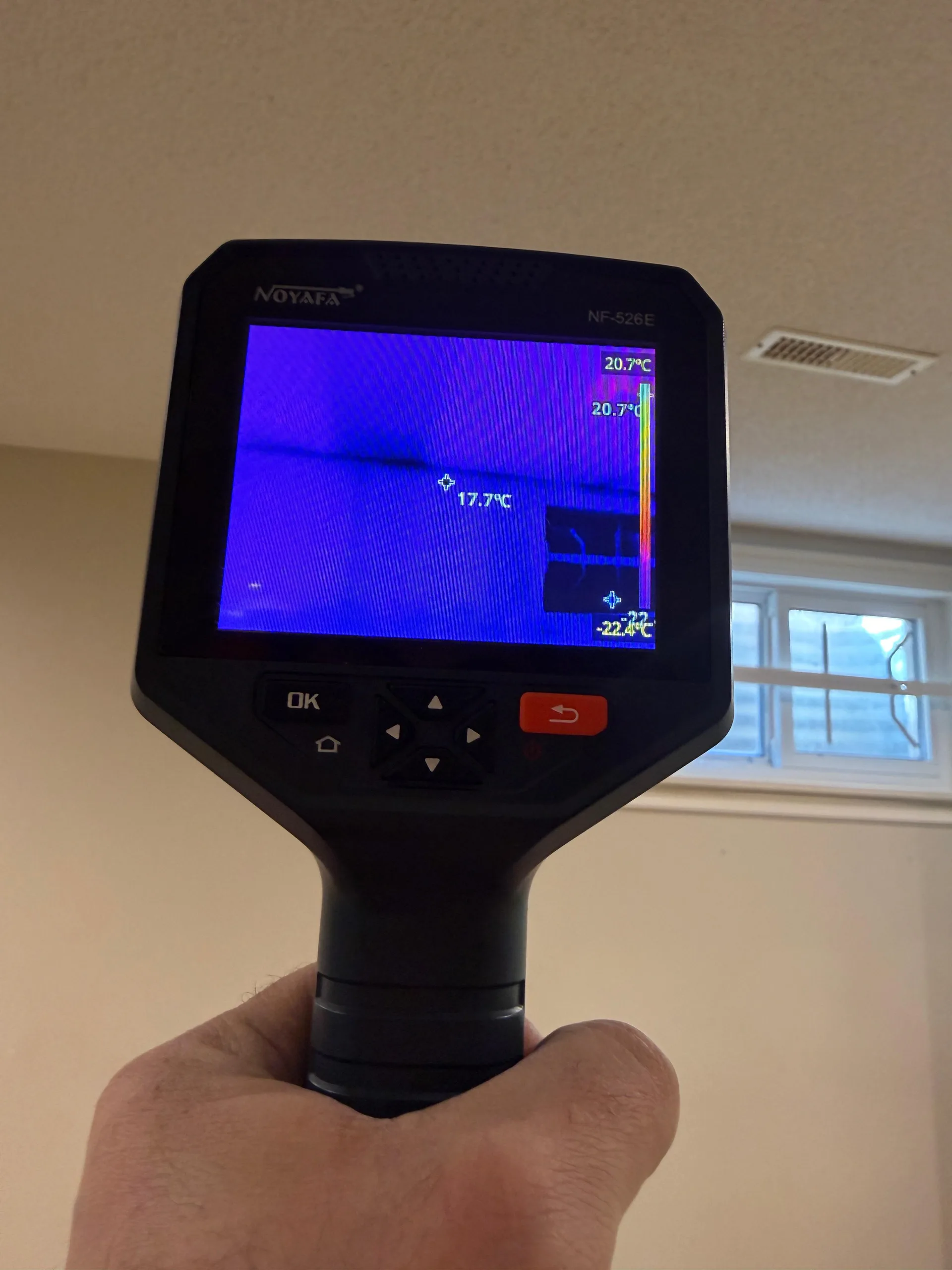 Infrared cameras show temperature differentials that indicate hidden moisture behind walls, under floors, and in ceilings. Wet materials evaporate and read cooler than surrounding dry surfaces — that is how we find the leaks you cannot see.